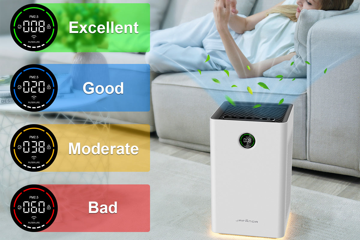 Our advanced PM2.5 sensor provides real-time air quality data, displayed through a color-coded system. The JF260 automatically adjusts fan speed based on air quality, optimizing performance and ensuring a healthy indoor environment.