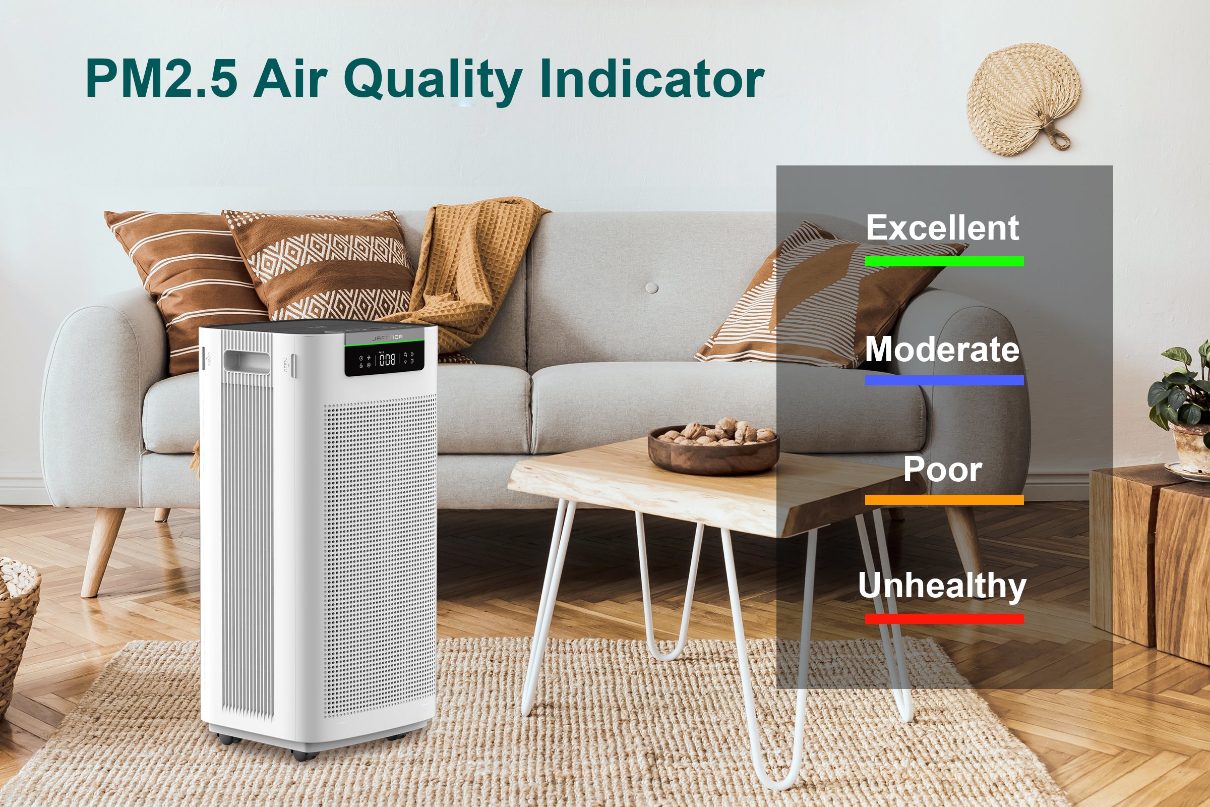 Our JF888 features a built-in PM2.5 sensor displaying real-time air quality with color-coded levels: cyan (excellent), blue (good), yellow (average), and red (poor). The auto mode adjusts fan speed for optimal indoor air.