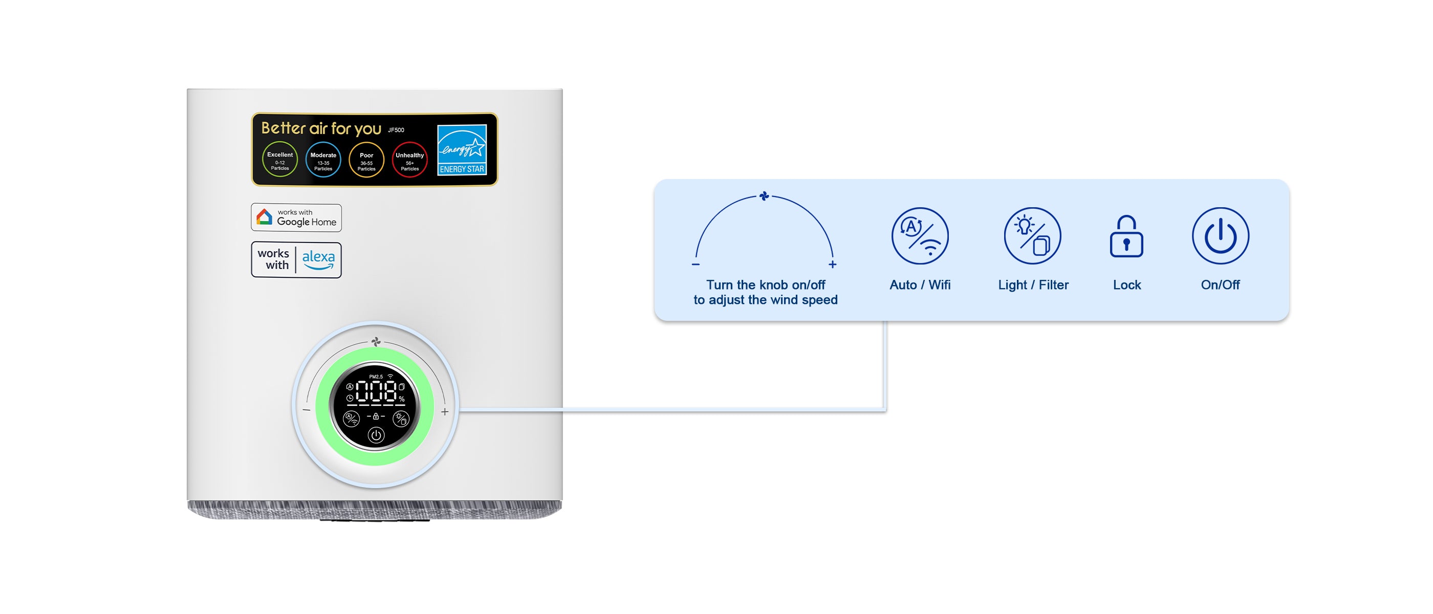 Our JF500 features a built-in PM2.5 sensor that displays air quality in real-time using a color-coded system. Automatically adjust fan speed with our intelligent auto mode for optimal indoor air.